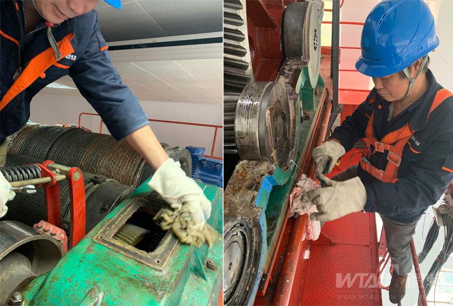 本次維護(hù)主要是對(duì)芭蕉河一級(jí)、二級(jí)站廠(chǎng)房橋機(jī)進(jìn)行全面檢查維護(hù)作業(yè),并針對(duì)老設(shè)備存在的安全隱患問(wèn)題,提出了針對(duì)性的處理意見(jiàn),電廠(chǎng)對(duì)我方提出的處理方案積極響應(yīng),經(jīng)過(guò)技術(shù)討論,對(duì)兩臺(tái)橋機(jī)減速箱內(nèi)老化油脂進(jìn)行全部更換、電氣回路進(jìn)行問(wèn)題排查處理,加裝安全保護(hù)裝置及儀表。
