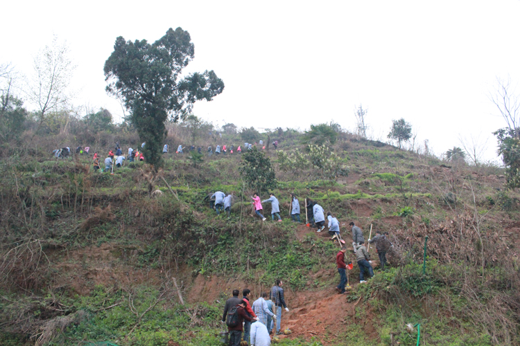 植樹小分隊(duì)開(kāi)始上山,秩序井然,安全第一