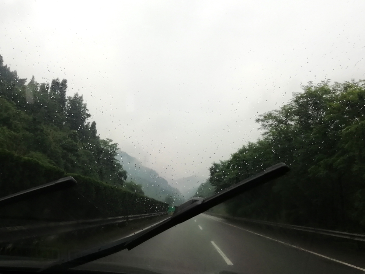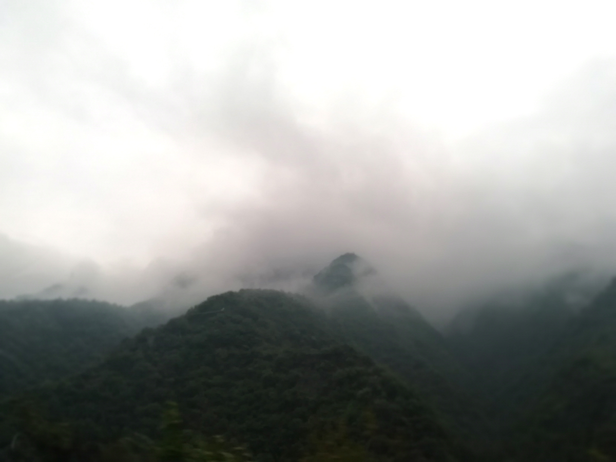 山上的路,和三年前一樣,一路上有大卡車在運(yùn)送著泥土或石子。有兩處工地,在做塌方修復(fù)施工。雨慢慢也下大了,逐漸的山里霧氣彌漫,能見度不足100米,車速越來越慢了。