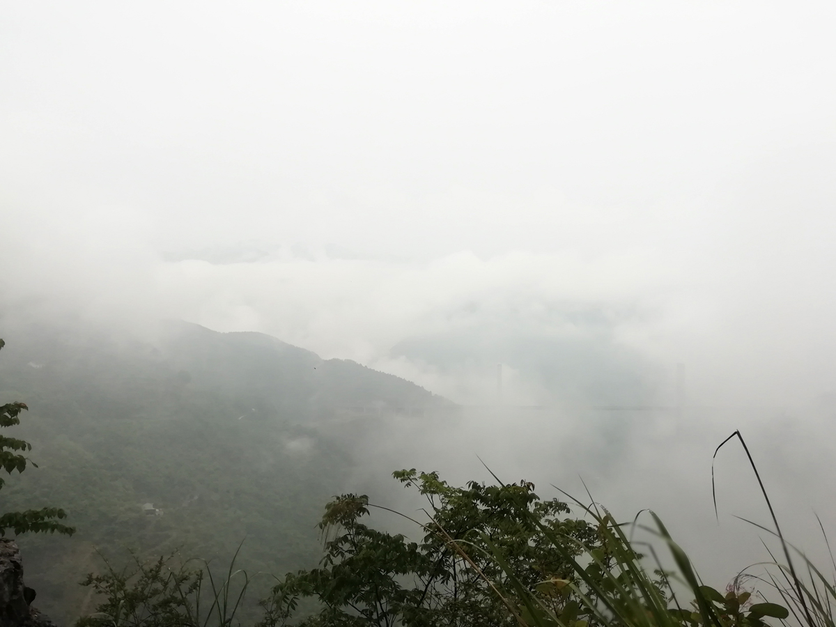 路邊便是陡峭的崖壁,可以隱約地看到遠(yuǎn)處有一座橋梁橫跨在兩山之間,云霧之中,破為壯觀。這里的空氣,讓人有一種久違的感覺。