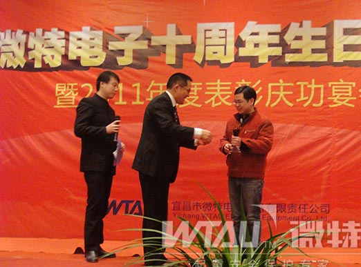 2011年度先進(jìn)表彰,明星閃耀?,F(xiàn)生產(chǎn)部主管:羅毅,榮獲年度最燦爛的大獎(jiǎng)“微特之星”稱號?。▓D為頒獎(jiǎng)現(xiàn)場)